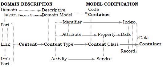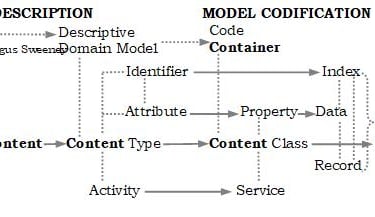 Content type attributes, identifiers, and focused activities align to class properties, data indices and services respectively, and a service supports a specific activity.