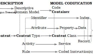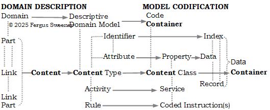 Content type attributes, identifiers, focused activities, and rules align to class properties, data indices, services and coded instructions respectively, and a service supports a specific activity.